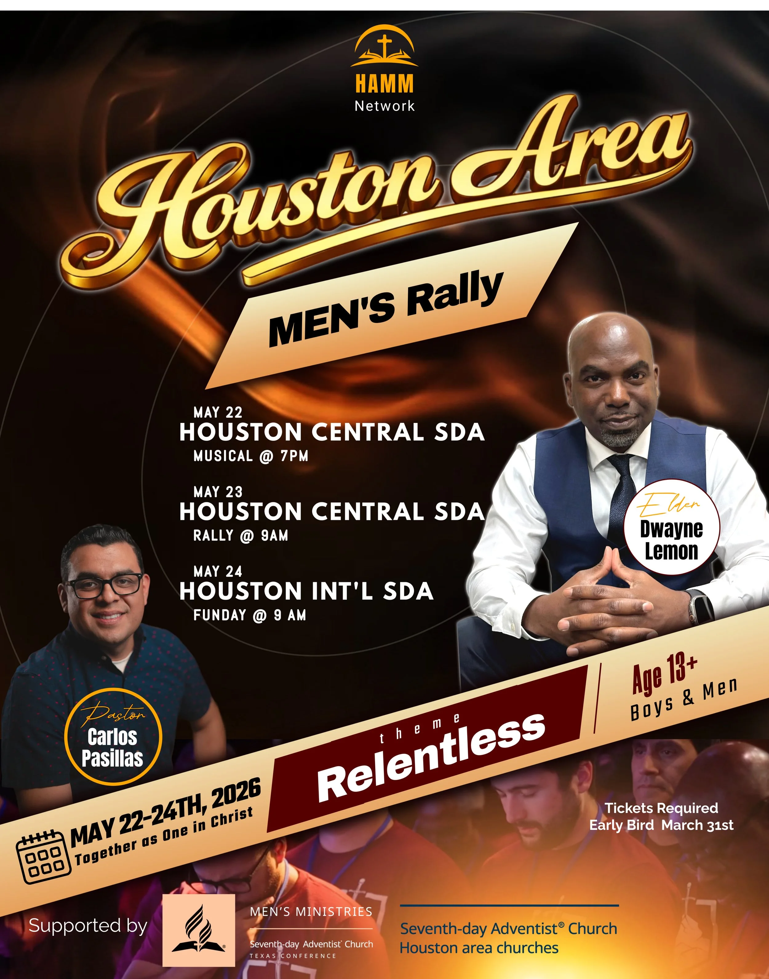 Houston Area Men’s Ministry Rally & Retreat is happening May 22–24! Join hundreds of men from across the Houston area for a powerful weekend of worship, revival, brotherhood, and leadership development. Featuring Elder Dwayne Lemon and dynamic breakout sessions. Bulk church registration opens soon — contact your Men’s Ministry leader for details.